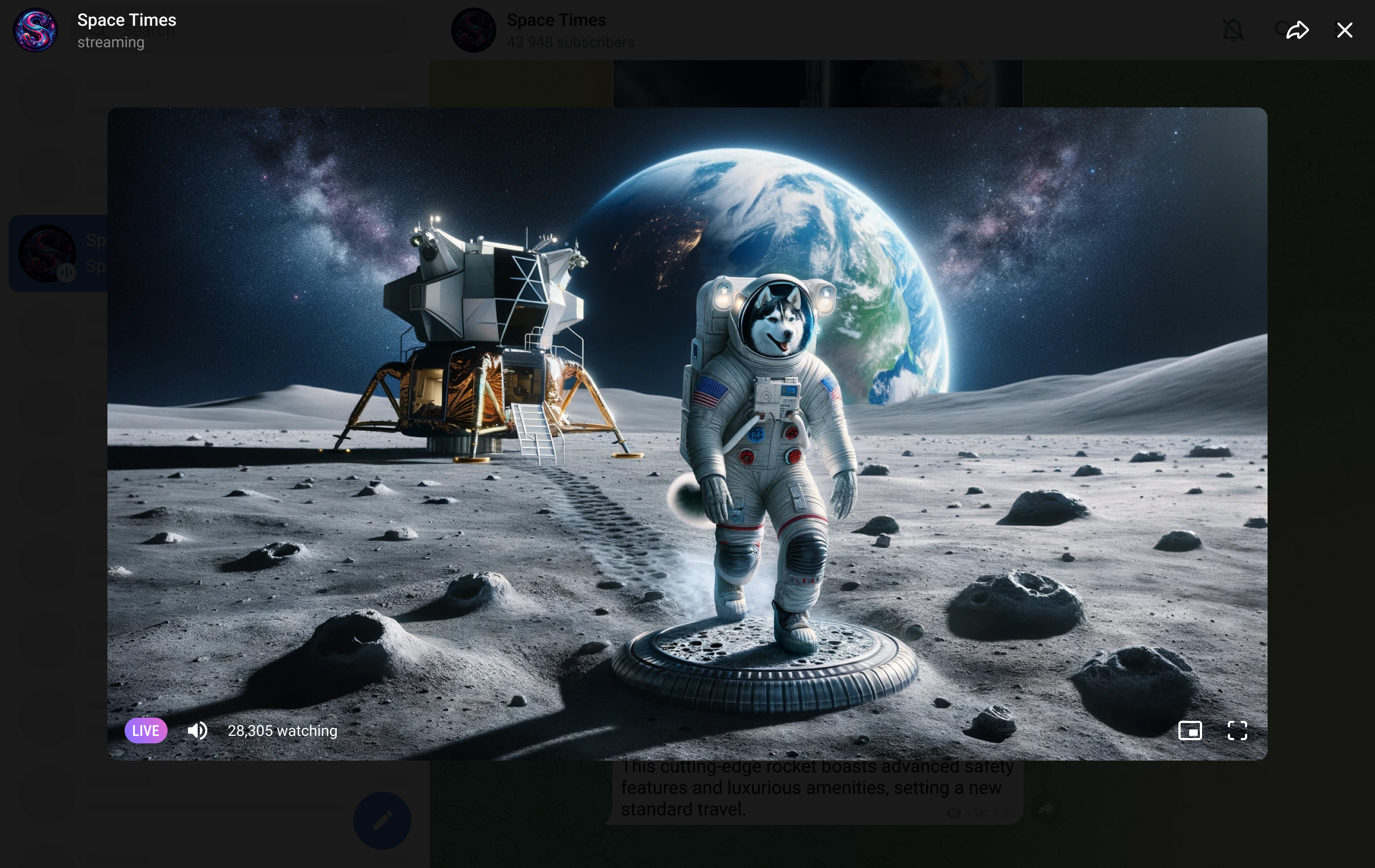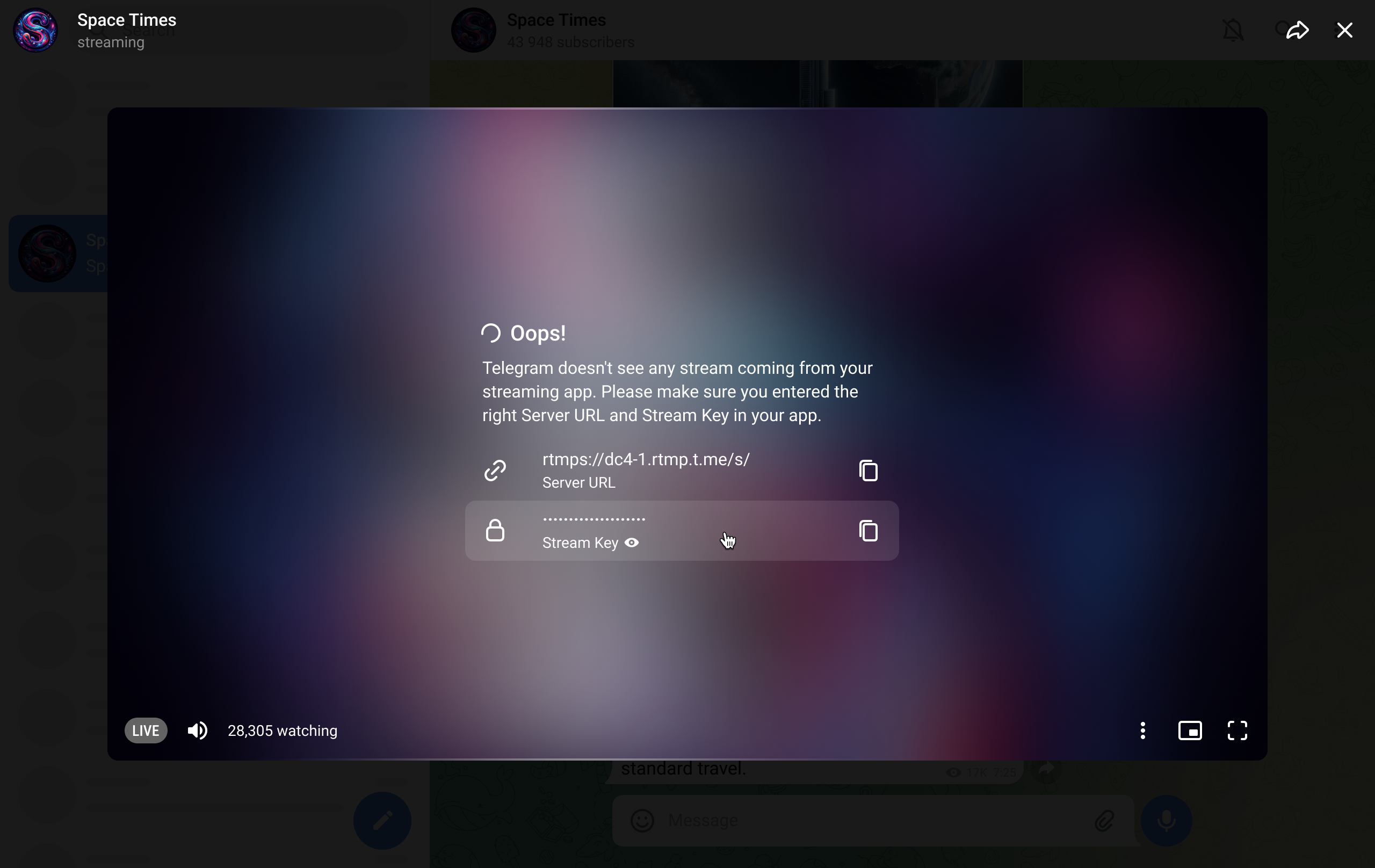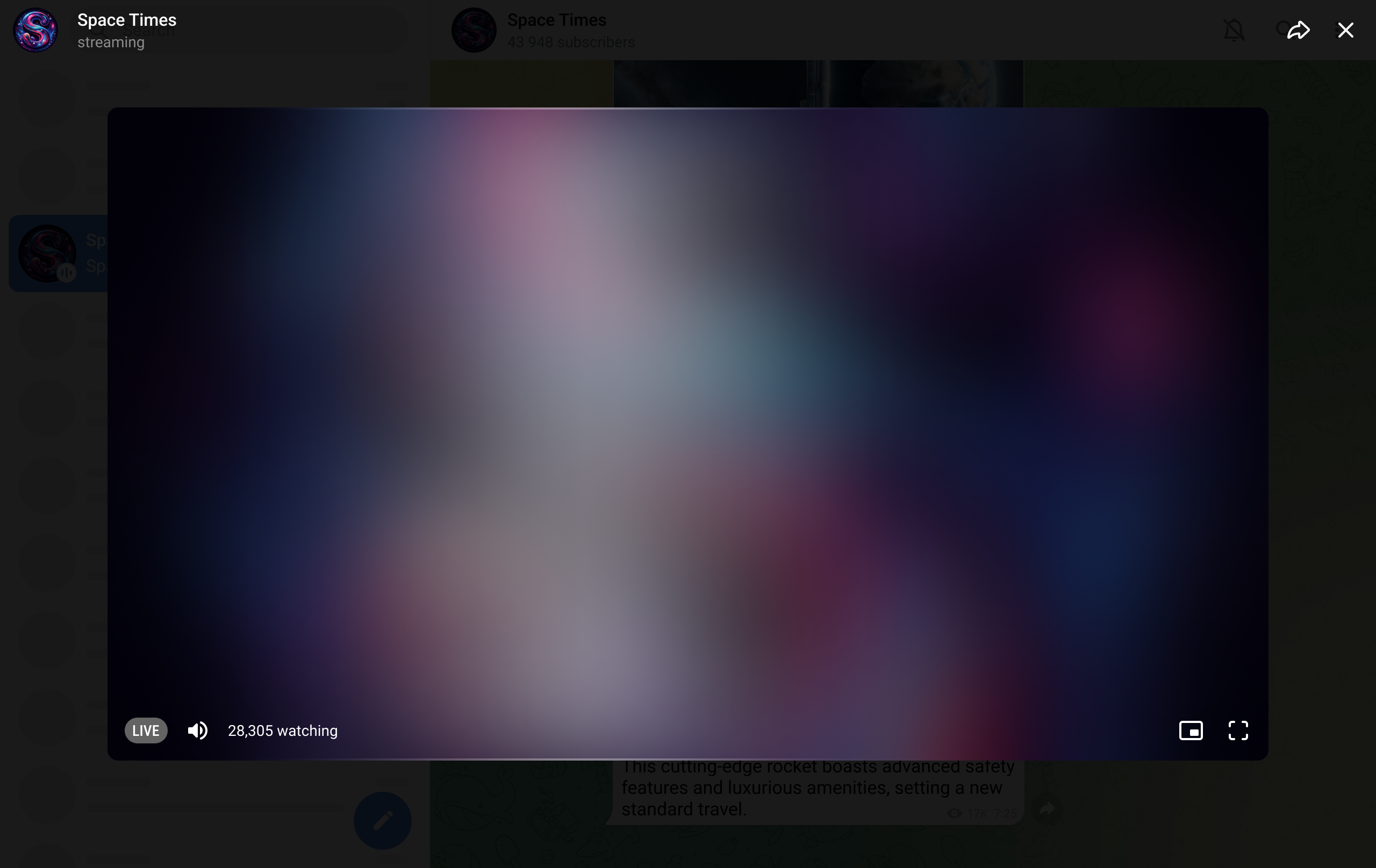 Once a user joins the Live Stream, the app should present them with a relevant layer on top of the screen. The 'LIVE' indicator remains grey until the video stream is fully loaded. The app should use the channel's profile picture as a placeholder, or the last video frame if the user rejoins the same Live Stream. For a reference on the animation, please see the native Telegram apps for Android and iOS.