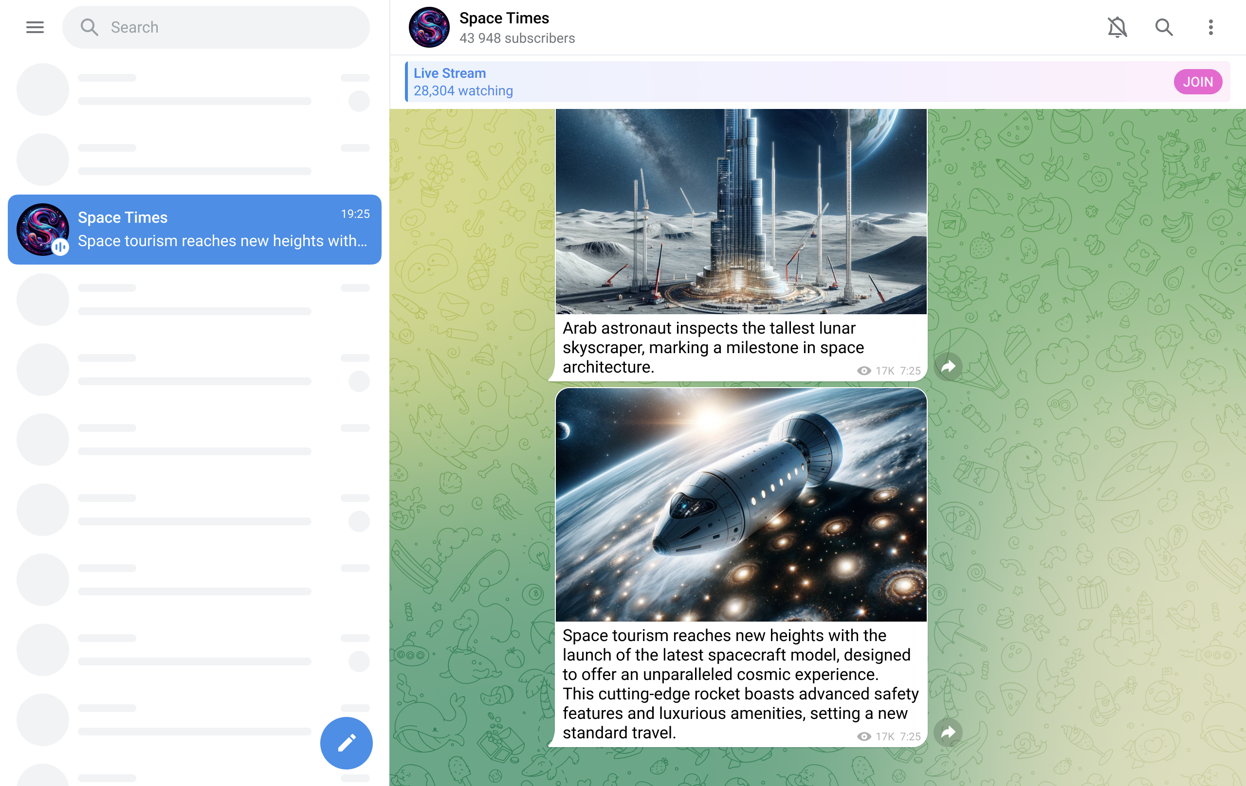 The channel indicates when there is an ongoing Live Stream by displaying an icon in the chat list and presenting a 'Live Stream' bar inside the channel. This bar includes a viewers counter that updates in real-time. The 'JOIN' button should animate once every time the channel is reopened. For a reference on the animation, please see the native Telegram apps for Android and iOS.