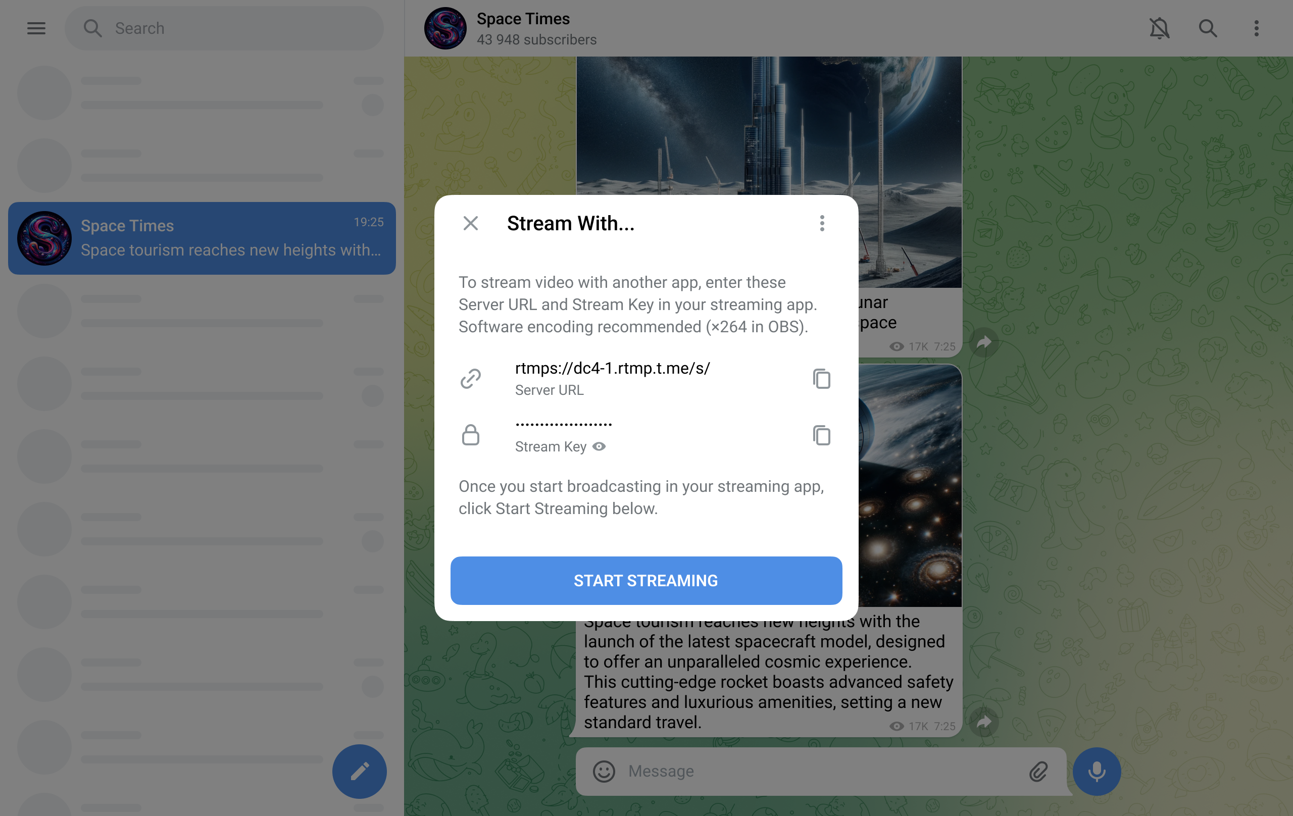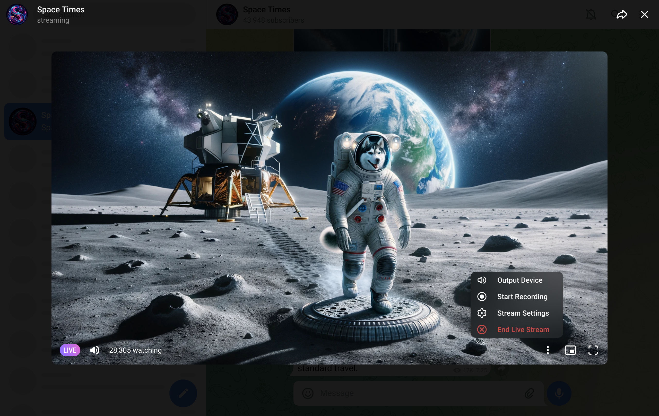 Channel admins can start a Live Stream by going to ⋮ in their channel and selecting 'Live Stream'.