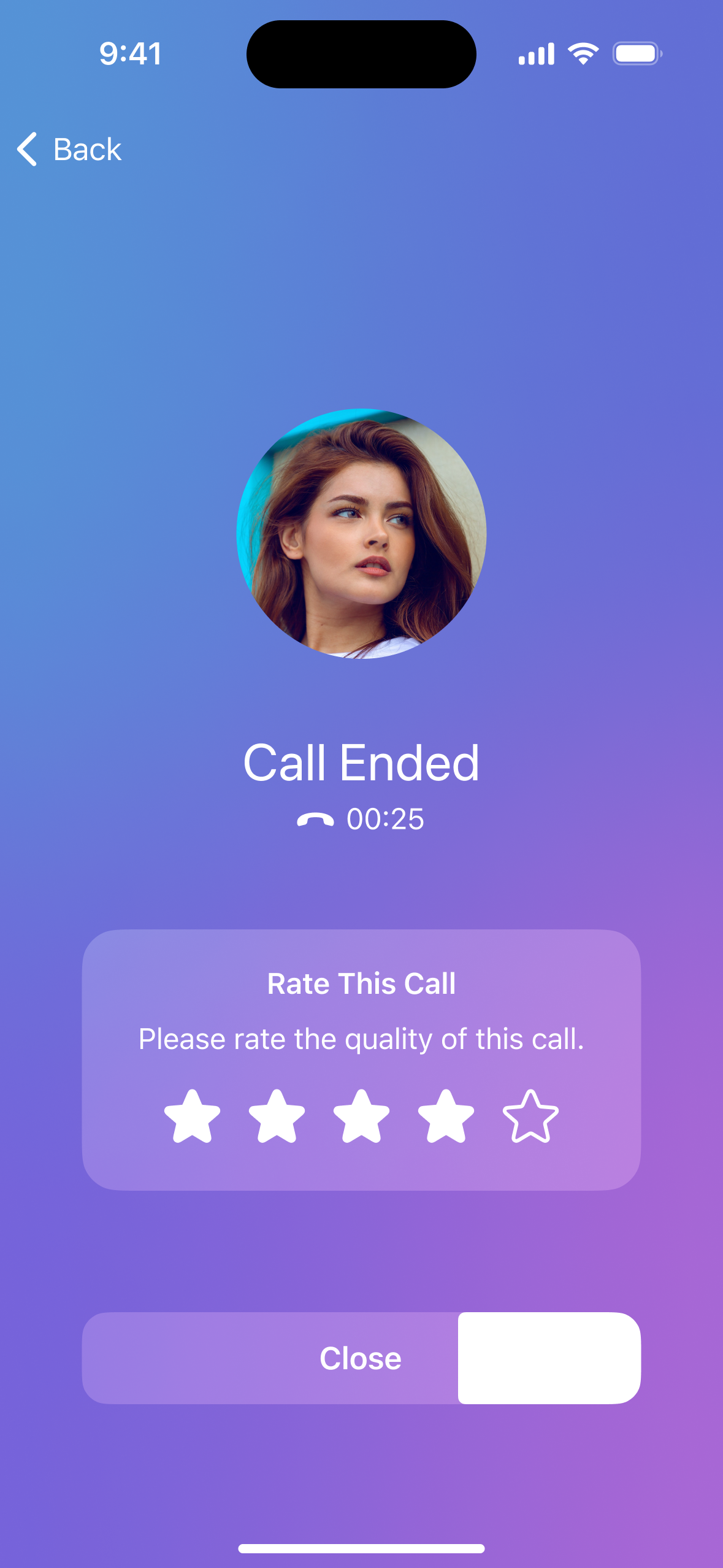 The app should present a Rate Call screen if prompted by the server. Pressing any value should produce an animated effect inside the star box. The app should additionally play a fullscreen effect, when a call is rated with 4 or 5 stars.