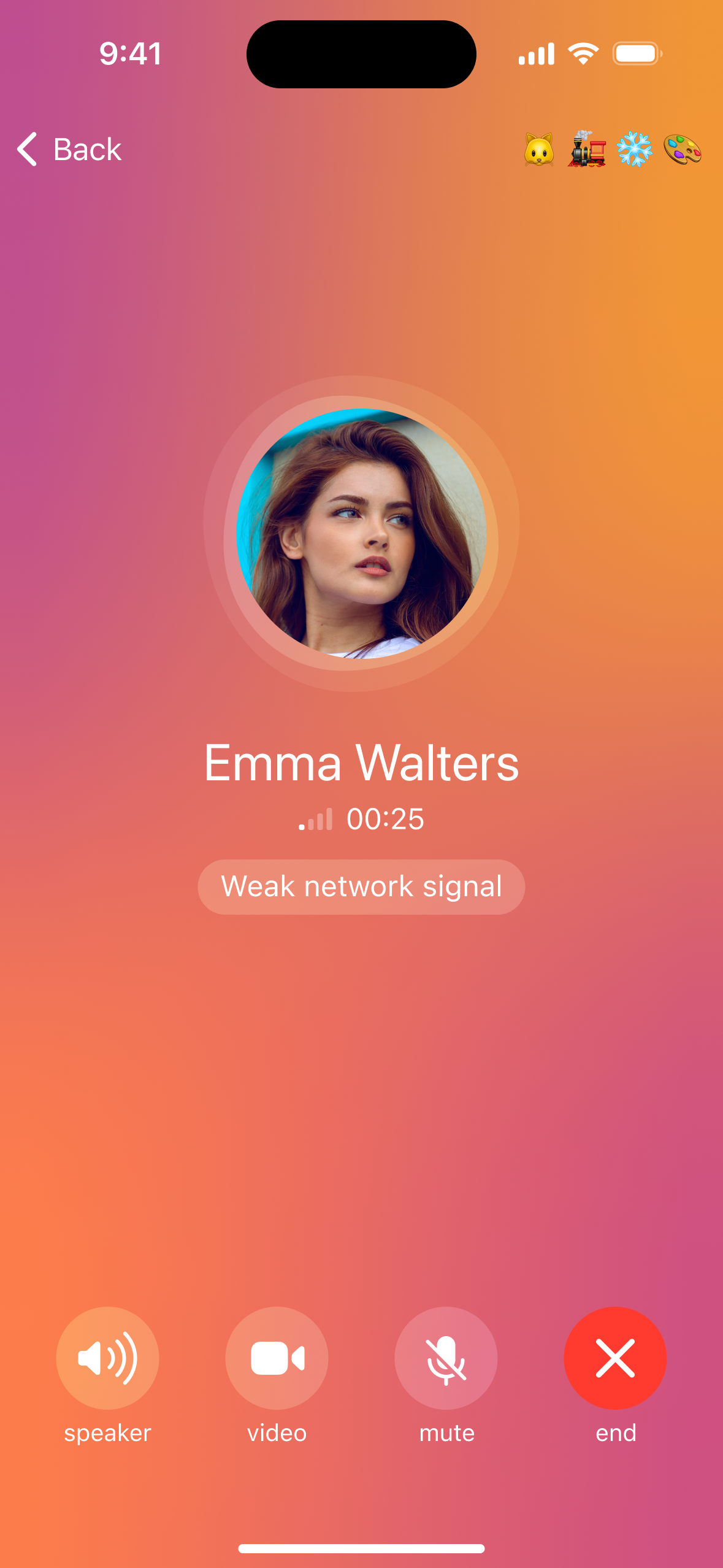 - Weak Signal. If the ongoing voice call is affected by weak network conditions, the app should switch the background to “Orange-Red”. This background is never used in the general transition queue and is reserved for weak signal conditions.
