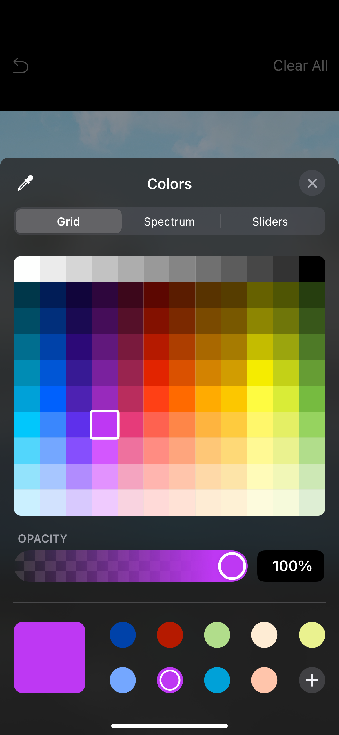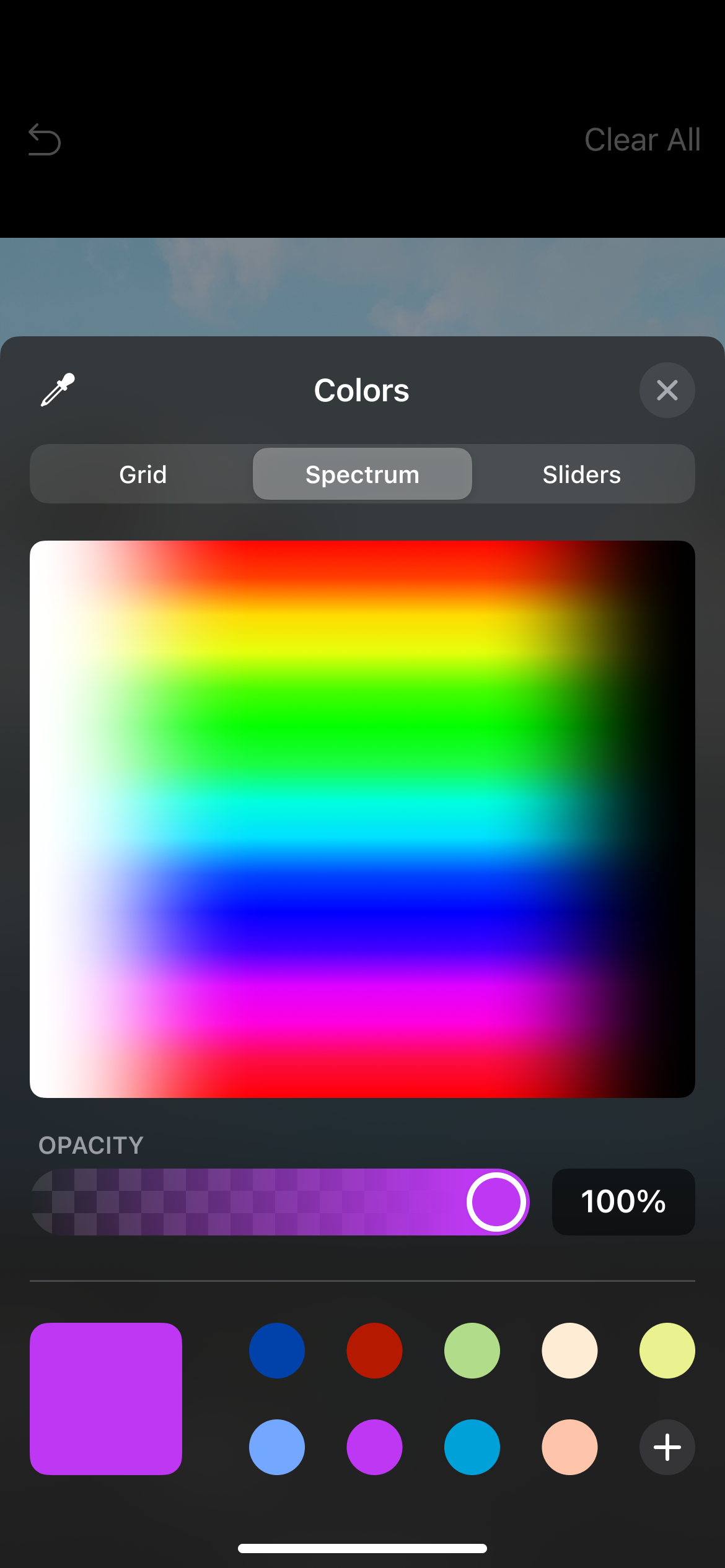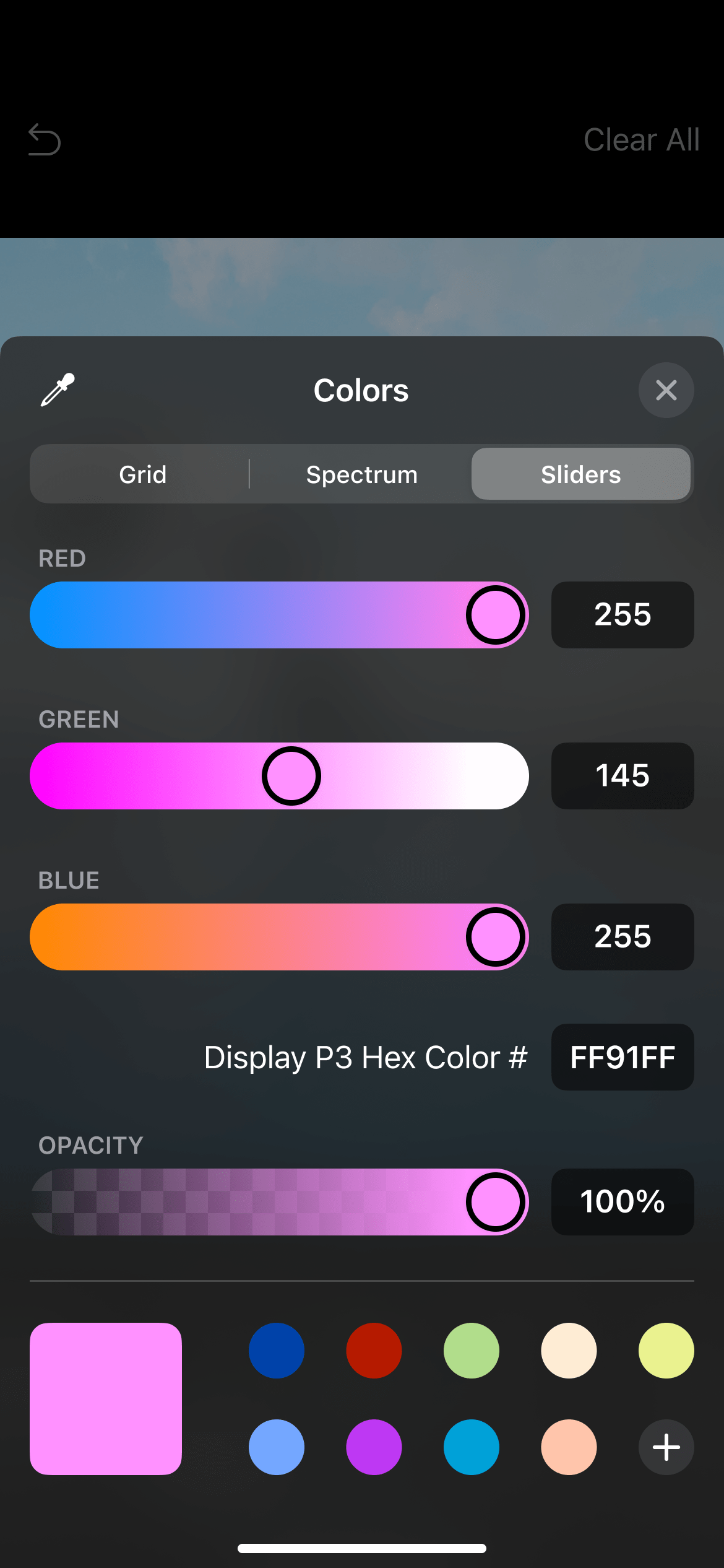 - Selecting Colors – Tapping the button should open a full-size view with tabs for ’Grid’, ’Spectrum’ and ’Sliders’. Users should also be able to press and hold the button for the color selector – opening a smaller window with a color spectrum that they can swipe over to pick a color.