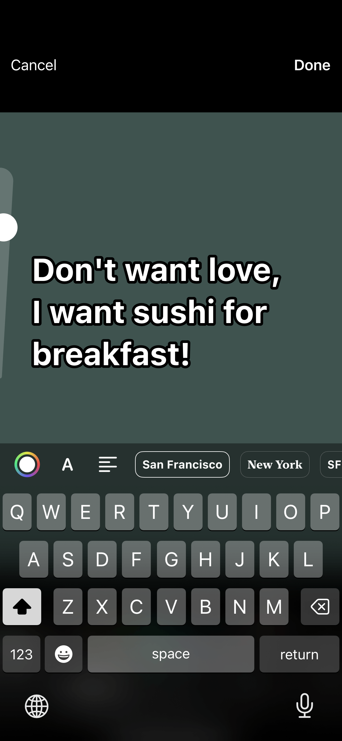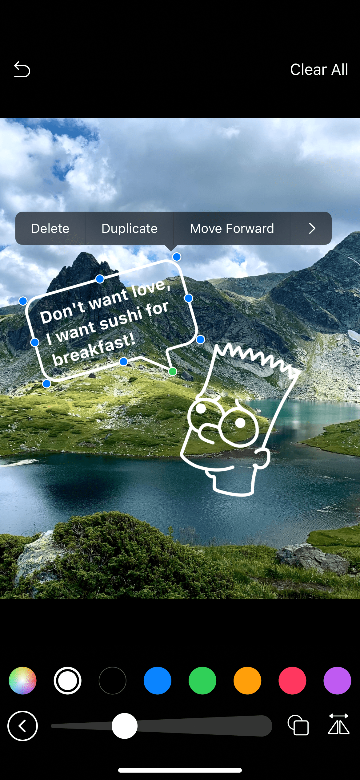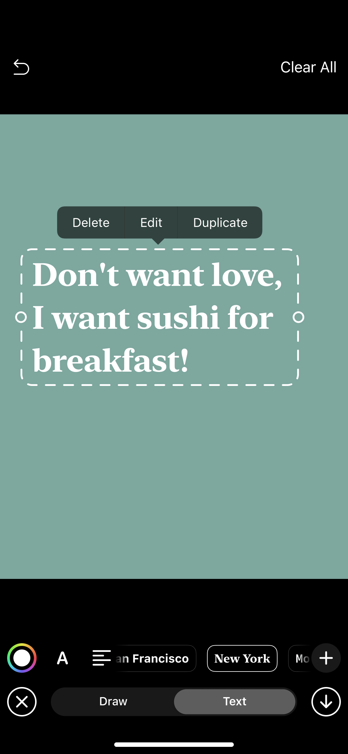 The right side of the panel displays available fonts – each presented as a small scrollable bar. Once the bar goes under the rest of the panel by scrolling left, it should become semi-transparent. Similar to shapes, any text placed on the canvas can be moved, transformed, duplicated or deleted by tapping it.