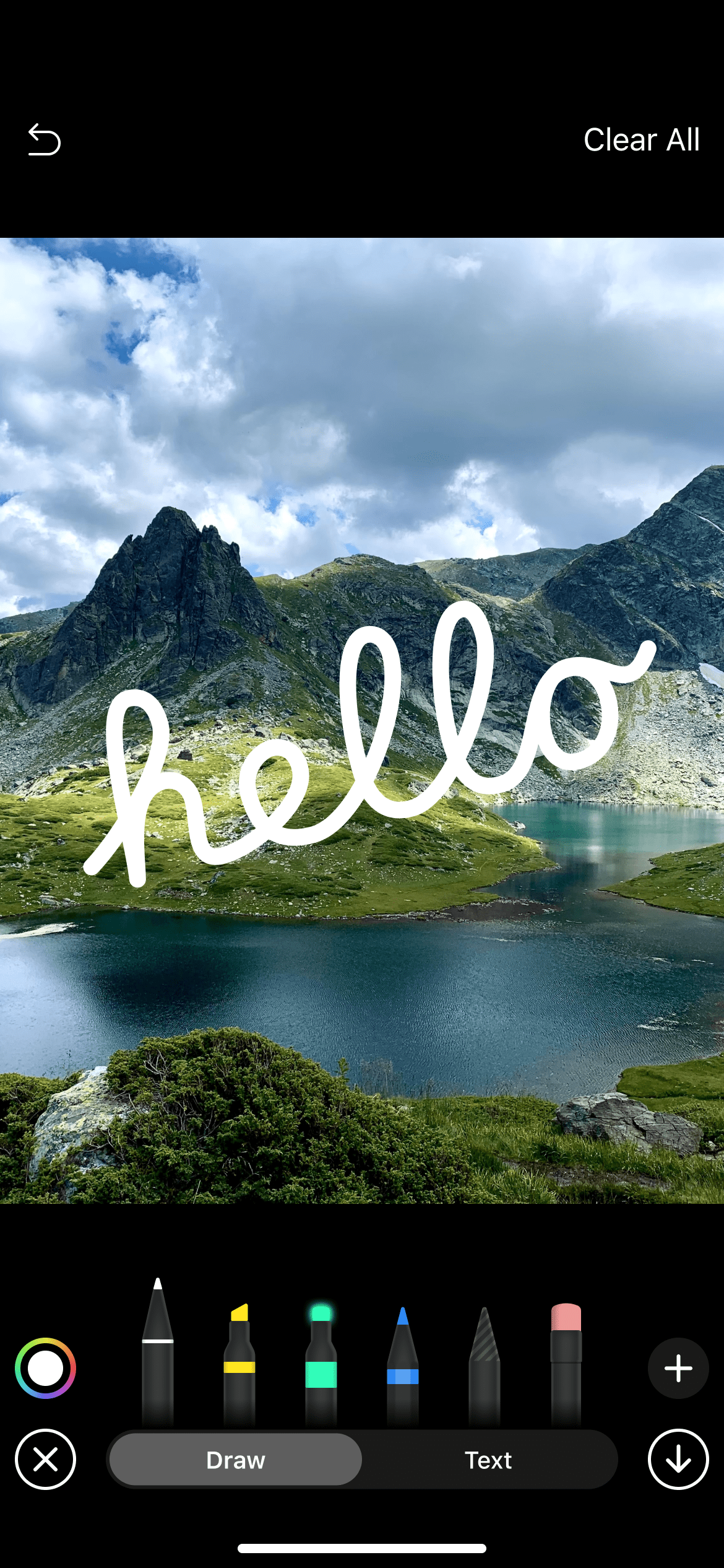 Text tools should be available in the second tab. The text editor panel should appear in the lower part of the screen or above the keyboard when expanded (2 Font.mp4). The logic for selecting text color is inherited from the ’Draw’ tab.