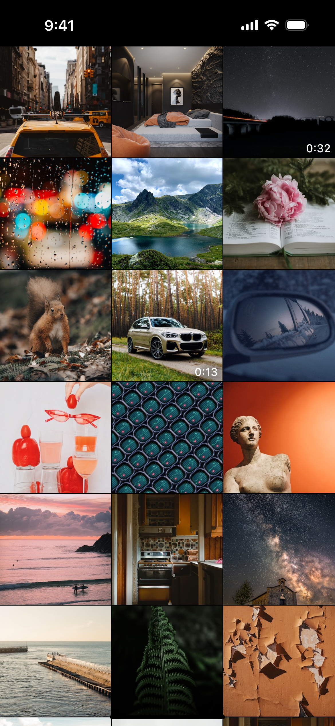 If the app has access to the Photo Library, it should display its content as a dynamic scrollable grid (02 gallery.png). If a video is represented in the grid, a duration timestamp should appear in the bottom-right corner of the tile. Using a pinch gesture to zoom in and out should make the grid scale and change its layout exactly as shown in the 4 CollectionView Zoom.mp4 visualization.