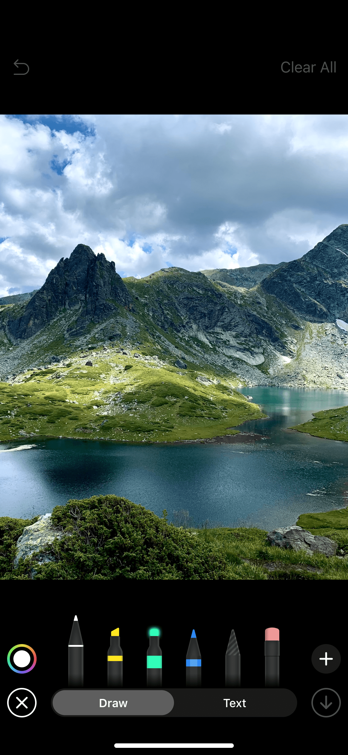 Tapping an item in the gallery opens the editor (03 creative tools.png). The ’Draw’ tab is the default option. The elements ’Undo’, ’Clear All’, and ’Save to Gallery’ have two states – default inactive for unedited media, and active after changes are made. If a user leaves the editor with unsaved changes, discarding media should be prevented with an alert. The app should provide a ’Zoom Out’ option to restore the default scale after the canvas has been zoomed in.